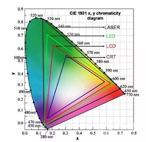 好的色彩将直接带给我们视觉上的震撼,比如《某凡达》中色彩斑斓的画面会让我们记忆良久,那么放映系统中如何量化每种光源所能达到的色彩呢,我们有国际通用的NTSC标准、DCI标准和Rec.2020标准,从下图各类光源色彩覆盖范围可看出,RGB纯激光光源覆盖色域是NTSC标准的2倍、DCI标准的1.57倍,覆盖人眼所见颜色90%以上,达到Rec.2020标准,各类光源对比可以看出RGB三色激光光源才是目前色彩还原的王者。