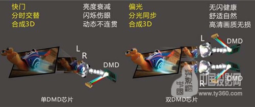 2,快门分时式是家用市场主流3D,是因为TI一家独大以及成本低廉决定的,但其也有非常明显的缺陷不可克服,且对人眼有伤害,因而不提倡作为长时间使用的3D投影机,只能作为一种辅助功能,算是一种过渡技术。