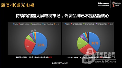据中怡康数据统计,2017年1-5月份,海信激光电视在85+超大屏电视市场上的占有率高达56%,意味着市场上每出售两台超大屏电视就有一台是海信激光电视。由于海信88吋激光电视的高调入市,海信也逐渐抢占了80+超大屏电视市场的高地,2017年上半年的市场份额接近40%,稳居榜首,外资品牌已经不再是超大屏电视市场的话题核心。