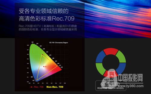 2015年,明基发布色准大师系列家用投影机,提出以Rec.709国际高清色彩标准再现影片真实色彩,这也是蓝光高清影片、高清电视等家庭主要消费片源所遵循的色彩标准。为了符合这一色彩标准,明基色准投影机的色轮配色角度经过了多次实验,实现了红绿蓝三原色的精妙配比。同时结合低色散光学玻璃镜头,减少图片边缘的色彩异常现象。其中W2000、W3000画面通透、色彩真实,肌肤自然红润,获得不少消费者的心。