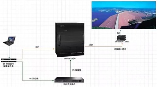 信号源-矩阵前端的备份:笔记本输出到双模发送器分别以光纤和IP网络的方式传输到PRO矩阵,PRO矩阵拼接上大屏显示。当矩阵的光纤输入端有故障或者光纤线路中断时,可直接调用通过IP方式备份的信号到大屏。