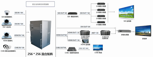 本案例充分的展示了该系统性能强大,该例核心矩阵拥有64路SDI输入、64路DVI输入、64路HDMI和64路CVBS输入,本案例是针对公安系统录像设备丰富、录像设备各种输出接口样式多、多屏拼接显示且需要具有一定的远距离传输能力而研制的一套强大的视频处理传输系统。