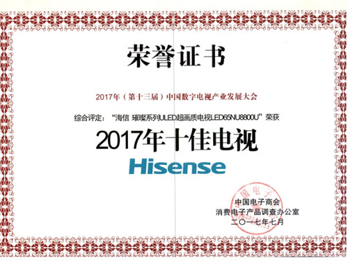 7月6日,在中国电子商会、中国电子技术标准化研究院共同举办的“2017年中国数字电视产业发展大会”上,隆重表彰了彩电行业表现出色的品牌和产品。海信电视凭借在国内市场连续14年领跑、在全球高端市场高居前三的出色表现,被评为“2017年消费者喜爱的电视品牌”;海信璀璨系列ULED超画质电视依靠高画质、高颜值和高体验的突出表现荣获“2017年十佳电视”大奖。