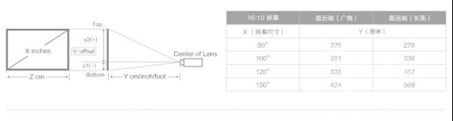 不同的投影机因幕布尺寸和比例不同,所需的投影距离也不同。参照下图,假设选择80’’、16:10的幕布,投影机则需要放置在距离幕布2.25m-2.7m处,这也比较符合一般客厅和会议室的。
