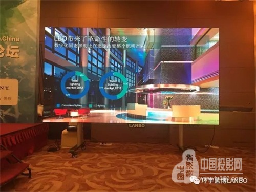 论坛会议厅的门口,LANBO同时也展示了雅典娜系列145寸平板投影,在像素显示方面,较阿波罗系列每平米提升了44%的显示像素,在同等显示尺寸,雅典娜系列显示的画面更细腻,更出色。