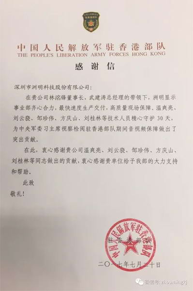 不辱使命 扬我军威——洲明科技收到驻港部队感谢信