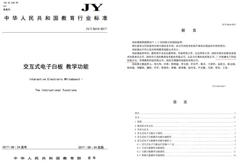 这两项标准分别是国家教育行业标准JY/T0614-2017《交互式电子白板 教学功能》和国家教育行业标准JY/T0615-2017《交互式电子白板 教学资源通用文件格式》。此两项标准已于2017年8月24日正式颁布实施。