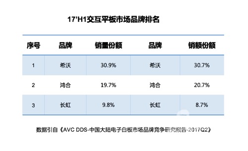 前不久,奥维云网公布的《AVC DDS-中国大陆电子白板市场品牌竞争研究报告-2017Q2》数据显示,2017年上半年交互智能平板市场中,希沃以30.9%的市场高占比稳居榜首,持续领跑行业。