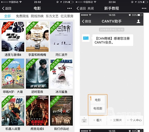 在微信中找到“CANTV助手”公众账号,在下方导航栏选择电影或电视剧。浏览页面选好影片后,点击“用电视看”即可在X1上播放,首次使用系统会提醒你没有关联到投影设备,点“新手教程”便会得到相应步骤。绑定后就可以投放观看啦。
