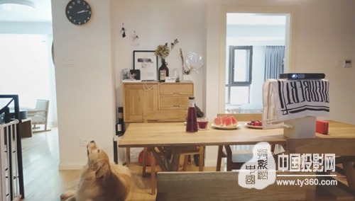 我喜欢边吃晚餐边看电视,所以我将X1摆在了桌子上,拿我的鼓垫一下,就刚好投在了恰当的位置。X1移动起来真的方便,而且一点不占用空间。