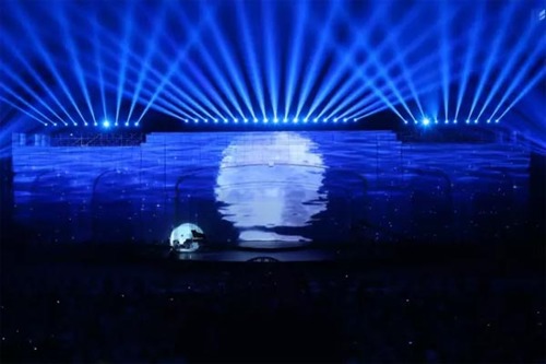 除了要完美表现创意内容,现场还需克服包括大幅度几何校正、拼接融合、多图层叠加、多点校正等诸多问题。其中,最为紧要的一项便是对亮度和清晰度的准确控制。在艺术总监徐强看来,投影机机位选取不能影响整体布局,而镜头景深又要保证每个区域都清晰不模糊,既不能使800平米的投影表现隐没于现场灯光秀之下,又要使投影表现与艺术家的现场表演相得益彰。
