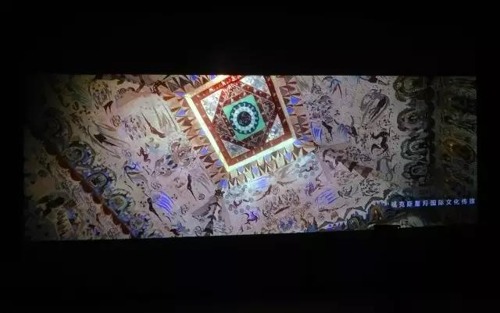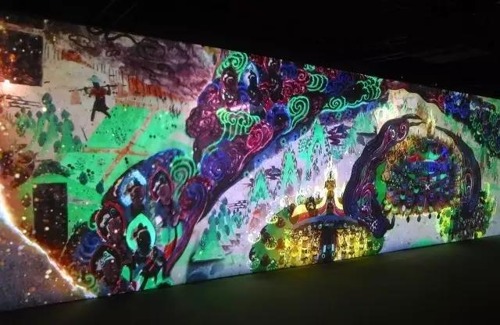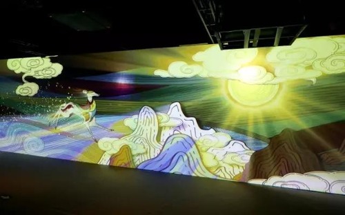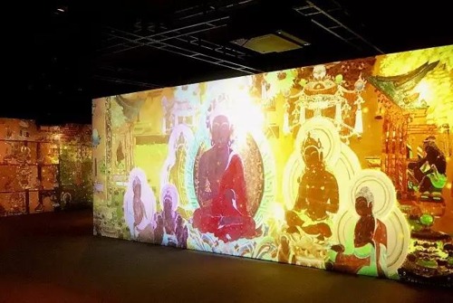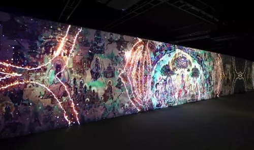 莫高窟始建于十六国的前秦时期,历经十六国、北朝、隋、唐、五代、西夏、元、清等历代的兴建,其大量的壁画、彩塑精美而生动被誉为“世界最大的艺术宝库之一”、“东方卢浮宫”。然而由于人为破坏、自然风化、保存不当等原因,导致现存于世的作品早已不复当年的光鲜亮丽,很多壁画早已剥落,无法窥其原貌。在这次艺术展中运用数字手段再次临摹作品,在原有石窟剥落的基础上进行修复,新旧画面的完美合成让参观者仿若穿梭千年,看到古老匠人们刚刚完成作品时的风貌。
