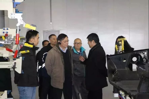 康得复材总裁谢富原为腾盾科技领导介绍试制车间正在组装的全碳纤维复合材料样车