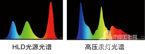 HLD固态光源光谱中红色的高度、蓝色与绿色的宽度都大幅优于传统光源,能够提供较高亮度,又呈现接近自然的高度淳美色彩还原。