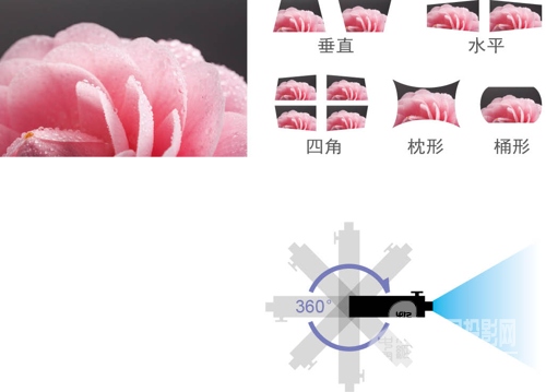 拥有手动和自动垂直梯形校正以及手动水平梯形校正功能、四角校正、枕形与桶形失真校正,可实现360度全方位投影。