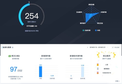 学校信息化教学数据走势、听评课数据、教师备授课数据、课堂氛围数据、课件热度排行、各年级学科课件分布、常态化过程评价…细致多维的各项教学小数据在希沃信鸽中一目了然,并能进行智能分析,让管理者对学校信息化综合情况了然于胸,轻松把握优势点与改善点,从而更高效便捷做出教学决策。同时,能与全省平均水平进行对比,做到知己知彼,轻松了解学校的竞争力,正所谓“信鸽在手,天下我有”。
