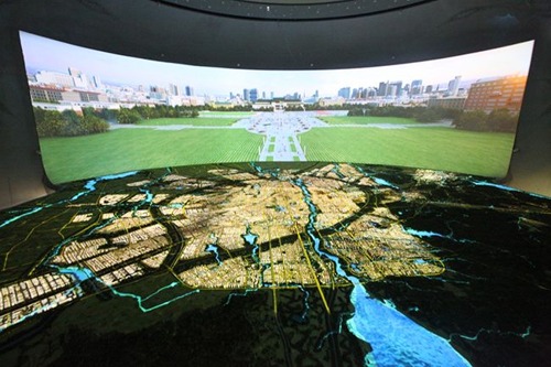 长春展览馆核心展项——多媒体沙盘厅是一个半球形的立体空间,地面是硕大的智能化大型城市沙盘,周边是双曲面弧形屏,顶上是天幕联动投影。如此复杂、独特的沙盘厅设计上在国内是独一无二的,视觉效果非常震撼。