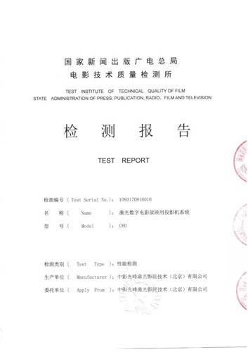 C60激光荧光粉放映机通过电影技术质量检测所认证