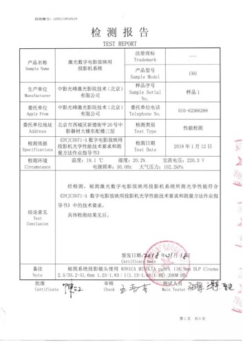 电影技术质量检测所是经中国合格评定国家认可委员会(CNAS)认可的电影行业唯一的国家级检测机构,拥有国际先进水平的专业技术检测和质量认证服务,为中国电影产业的发展提供了重要技术支撑和核心保障作用。此次检测完全按照《DYJC3071-A数字电影放映用投影机光学性能技术要求和测量方法作业指导书》的标准,证明了C60光源的优质性能。