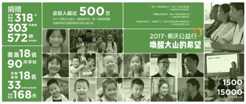 2017年,希沃发起“唤醒大山的希望——2017希沃公益行”,为全国18个省共90所学校了捐赠了318台交互智能平板设备,并组织18名一线教师和33名希沃支教讲师团队一起深入大山,助力乡村教育信息化事业的发展,超过1500名乡村教师,15000名学生从中受益。