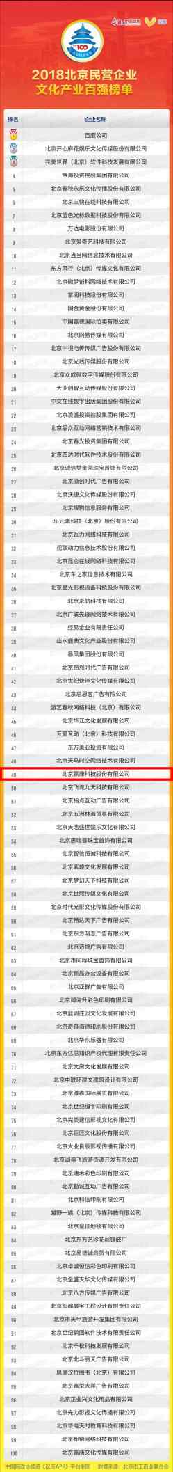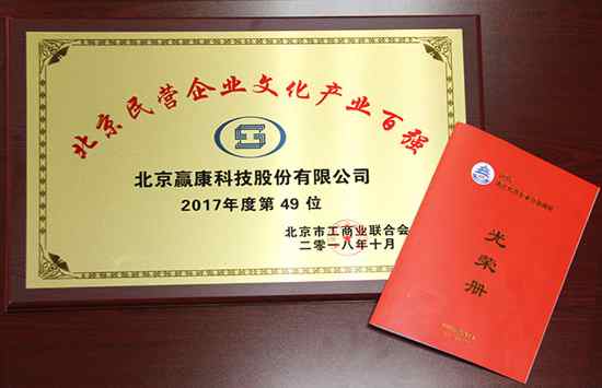 2018年10月19日,北京民营企业百强发布会在雁栖湖国际会展中心召开。发布会上,北京市工商联发布了2018北京民营企业百强榜单和专项调研报告。赢康荣登“2018北京民营企业文化产业百强榜单”第49位。