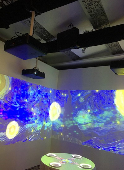 现场用一台5000流明、全高清1080P的明基激光工程投影机LU950单台投影到桌面,除了基本的餐具,绚丽的全息画面完全倚赖上方的投影机,定制片源点对点投映餐桌及餐具,再利用3D投影映射技术和动作捕捉技术,将餐桌布置成一场趣味表演秀的“舞台”。