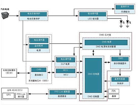 基于DLP技术的系统使用额外的传感器输入,关闭投射到对向车辆挡风玻璃上的前照灯部分,以免眩光对驾驶员造成不适或引起分心。前照灯系统中使用DLP技术后,可以对像素化的前照灯光束进行精细化控制,从而实现自适应远光功能,有助于提高夜间驾驶时的视野和舒适度。图3显示了在前照灯系统中采用DLP芯片组的系统框图的示例。