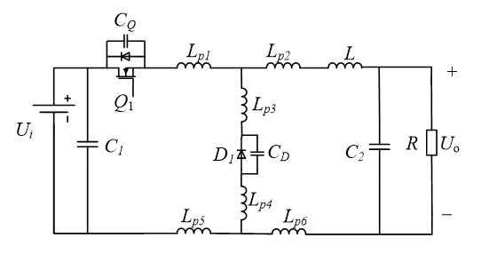 图3是降压变换器的等效电路。大多数设计人员都知道如何尽量减小高频回路中Lp1、Lp3、Lp4和Lp5的寄生电感,但忽略了Lp2和Lp6。对于两种不同的布局U型和I型,U型布局的Lp2和Lp6上的寄生电感相较于I型布局更小。在U型布局中,减小开关管Q1导通时的功率回路也将有助于提高EMI性能。
