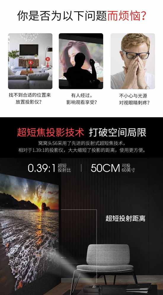 小体积、高集成的代表之作,采用超短焦镜头设计,拥有0.39的投射比,只需50cm的距离即可投射60英寸的画面,大大节省了空间,摆脱了投影距离的限制和布线的麻烦,投影位置更灵活,即使是放在电视柜上也能享受大屏带来的视觉刺激。 同时,超短焦的设计,即使站得近,也不会造成人走动时遮挡投影光路的尴尬,不用担心自己的身影阻挡投影画面,还可以避免投影机强烈的光线直射入眼睛,造成不可预期的伤害。