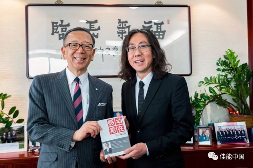 佳能(中国)有限公司董事长兼首席执行官小泽秀树与TVLB锐驰转播丛枫总经理合影留念