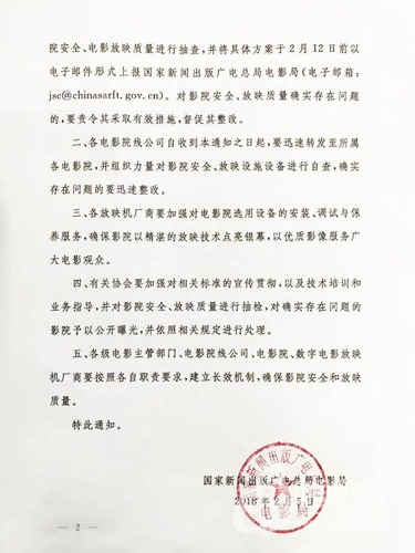 保障电影安全优质放映、提高电影放映质量,是每个电影从业者义不容辞的责任和义务。影院如果忽视放映质量,不仅影响观众观影体验,更会对影院造成损失。尤其春节期间影院客流加大,设备工作时间延长,放映频次增多,容易引发安全事故。因此通知的下发,给电影行业敲响了警钟。通知指出,各放映机厂商要加强对电影院选用设备的安装、调试与保养服务,确保影院以精湛的放映技术点亮银幕,以优质影像服务广大电影观众。