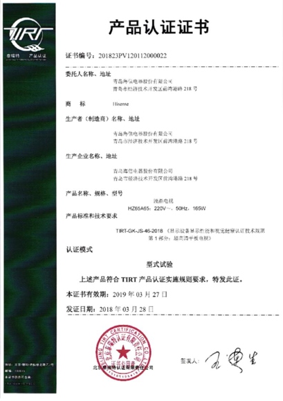 3月29日,国家广播电视质量监督检验中心召开了“显示设备显示性能和视觉健康”认证发布会,海信65寸U7A和A65两款新产品以卓越的显示性能和独有的护眼模式设计,顺利通过了《显示设备显示性能和视觉健康认证技术规范》中相关性能指标的检测,成为首批获得“视觉健康认证”的产品。