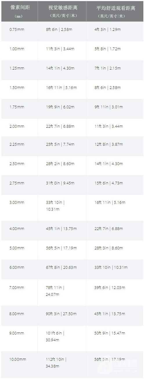 计算公式为:像素间距×10=近似观看距离(以英尺为单位)