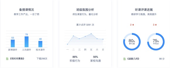 通过此方案,用户可随时查看在教学过程产生的数据,如:课件制作量、听课评分、学生点评等,学校管理者在办公电脑即可了解学校信息化教学综合实力分析、学校整体教学情况、教师评价等教学数据及分析,并根据分析报表及推荐优化方案全面了解学校信息化教学情况、优势点、薄弱点,客观评价教师工作,进行全校教学管理。