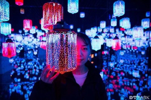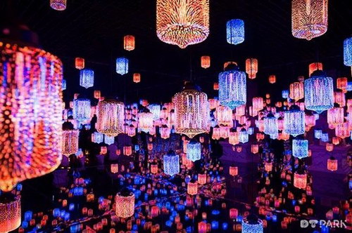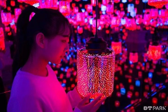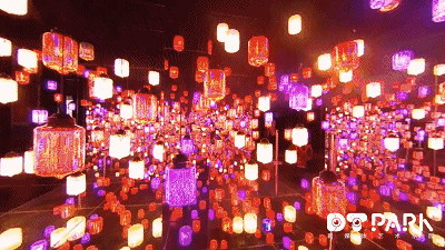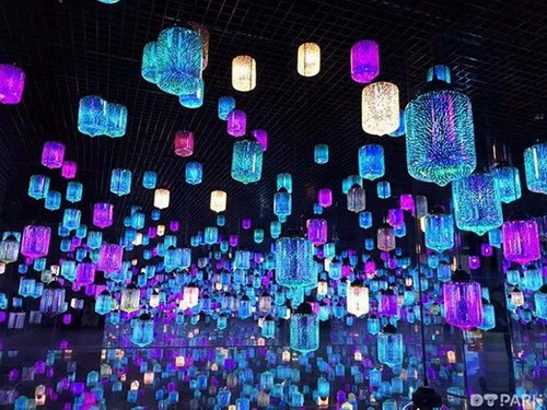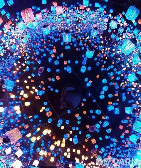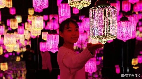 在『梦幻迷镜』里,几千盏灯散发着色彩各异的光,明亮而温馨地照耀穿梭其中的每一张面孔。在这里,数字空间和实体空间相融合,房间的地面和墙面都像镜子一样能够反射光线,投影着灯盏的形态和颜色,营造了如梦如幻的沉浸式体验。