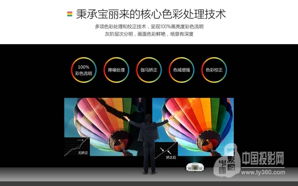 2、全色彩亮度让色彩显示更完美,颠覆投影只注重白光亮度牺牲色彩表现的传统,使用广色域光源,画面颜色更鲜艳、饱和度更高、影像更有层次感;