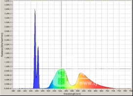 接下来聊聊另一个技术奥秘。混合后的白色光,在进入DMD之前,还要通过一块滤色片,作用是将颜色校正到符合DCI放映的标准。如下图所示,未经过滤色片的光谱,中间含有很大成分的黄色,这样的分布是不能满足DCI电影放映色彩标准的。而滤色片的作用,就是将这部分颜色过滤掉,使得红绿蓝三色以最佳的比例混合出白光,将校色后的白点坐标(x,y)精准的落在(0.314,0.351)的允许误差范围之内。而这块滤色片,全名被称之为Yellow Notch Filter(黄色限波滤波器),意义就很明白了。