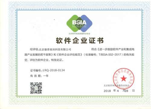 “2018年4月28日,经北京软件和信息服务业协会评估,北京德普视讯科技有限公司符合《进一步鼓励软件产业和集成电路产业发展的若干政策》和《软件产品评估规范》、《软件企业评估规范》的有关规定,评估为软件企业。”