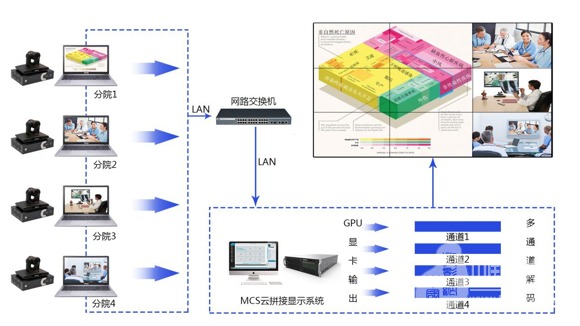 MCS云拼接显示系统,可以根据总院与分院的联动需求,组件全国范围内的多点多地医疗体系管理平台,按照权限级别开放各等级的权限控制,遇到紧急情况也可由分院平台直接反向控制总平台。