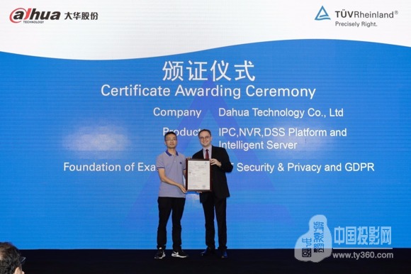 2018年5月24日,在通用数据保护条例(GDPR)正式生效的前一天,大华股份IP视频监控产品获得了德国TüV莱茵针对全球视频监控领域的IoT产品数据安全与隐私保护的首批认证证书。这也意味着,大华IP视频监控产品已符合欧盟GDPR(通用数据保护条例)要求。