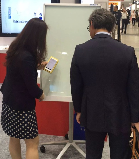 在展位中,StarBoard 42寸eChart手写板吸引了不少观展人员的好奇,纷纷驻足观看。在大家以为它只是一块单纯的移动白板的时候,我们StarBoard的讲师出现了。她通过WiFi,将手机和eChart手写板连接,软件会将eChart手写板上的原笔迹同步到手机中,完美呈现所写的内容。