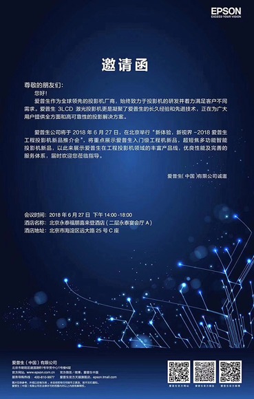 爱普生始终致力于投影机的研发并着力满足客户不同需求。爱普生3LCD激光投影机凝聚了爱普生的长久经验和先进技术,正在为广大用户提供全方位和高可靠性的投影解决方案。27日相约北京永泰福朋喜来登酒店。