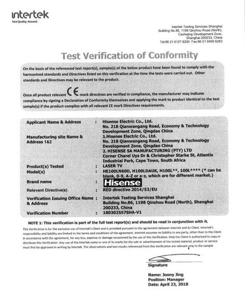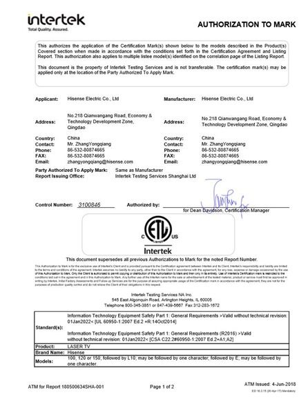 “海信激光电视目前已经取得了美国、欧洲的市场准入认证证书,并获得了在国际上互认的CB证书,三者对于海信激光电视对人体的安全性进行了严格测试和认证。”6月25日,海信方面对记者表示,海信激光电视产品已通过了全球最严苛的欧美市场安全认证,同时也通过了国家CCC和美国FDA激光安全认证,光辐射安全等级为RG0(最低光辐射等级,完全无害)。