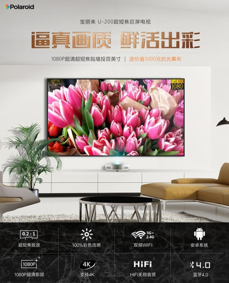 这款U-200不仅白光亮度高,LED光源色域也更宽,成像色彩亮度更高,颜色更鲜艳,100%的色彩流明输出使还原色彩更真实。搭配宝丽来U-200专用的100英寸进口抗光幕布,对色彩和亮度产生正增益,提升视觉亮度和色彩饱和度,能更有效的带给用户更加震撼的巨屏家庭影院体验。