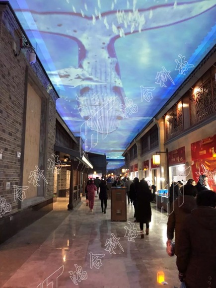 东鱼坊历史文化街区的多媒体展示分为两个部分:地下天幕街和古戏台