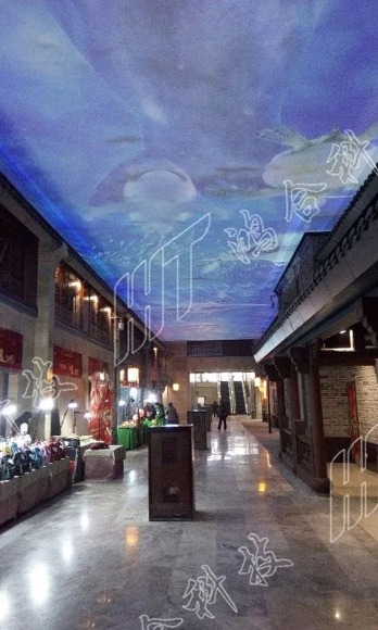 整个地下天幕街长210米,宽8米,高10米。视频图像由21台NEC NP-PX1004U+激光投影机投射到天花板,并使用专业的图像拼接处理软件,组成一个210长,8米宽的巨幅画面,图像内容有时是蔚蓝的天空,加上朵朵飘扬的白云;有时是绚丽的烟花齐放,渲染得五彩斑斓的夜晚;有时是清澈的海底,各种鱼类在漫步畅游,给步行在天幕街的游客一种身临其境的感受,体现出多媒体展示带来的科技感。