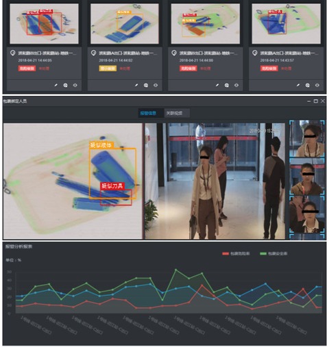 中心管理平台,实时接收违禁品报警并联动现场视频录像,实现实时管控安检现场情况。同时,对过包人员进行人脸抓拍比对,实现人包合一,嫌疑人员报警,将传统的物检与人检有效结合。平台还具备数据统计分析功能,通过对每日过包数据的统计,分析出过包量及危险物品量,为安检人员和警务人员的调配提供辅助信息,实现安检智能化管理。