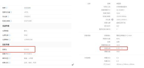 投射比对于激光电视是一个非常重要但又容易被忽略的参数,这个参数决定了激光电视摆在家里投射100英寸大画面时,机器和墙壁之间的距离。笔者从网上查找一款产品的投射比对比一下就非常形象了。