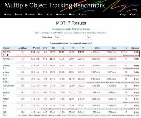 该任务中的行人数量多,且视频序列中行人存在大量外观变形,光照变化,快速运动和运动模糊,背景相似干扰,尺度变化,遮挡,低分辨率等难题。大华股份以54.1 MOTA的分值位列第一。