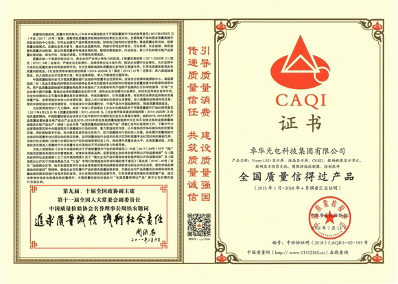 诚信,是企业立足之本,也是决定企业发展是否长远的必要条件,品质是企业的生命,Voury卓华作为业界领先的大屏幕显示及拼接控制整体解决方案提供商,旗下高端系列产品——“小间距LED显示屏”、“微间距LED显示屏”、“图像拼接控制器”、“控制软件”等荣获由中国质量检验协会颁发的“全国质量信得过产品”权威证书。这是对Voury卓华产品质量最有力的肯定!